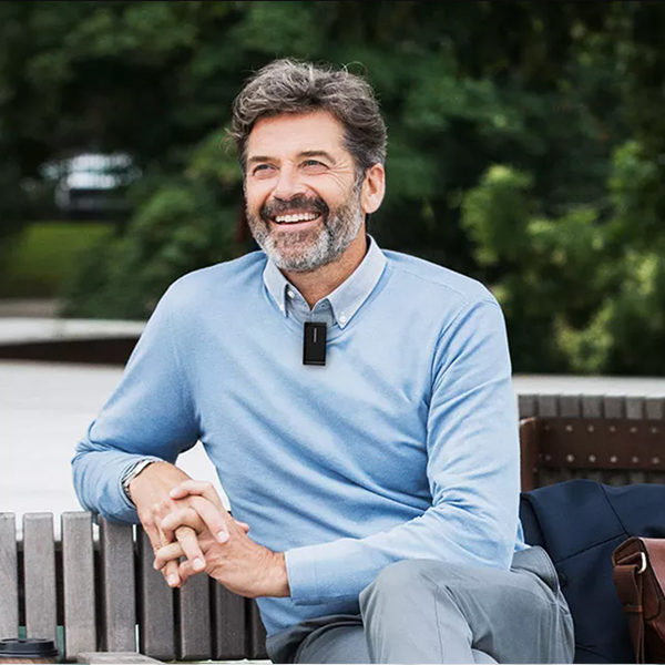 Transforme seus aparelhos auditivos Oticon em um fone de ouvido estéreo sem fio com o ConnectClip, para que você possa fazer chamadas com viva-voz e transmitir música pelo smartphone. Ou ouvir alguém falando à distância usando sua funcionalidade de microfone remoto. Você pode até usar o ConnectClip como um controle remoto discreto para seus aparelhos auditivos.